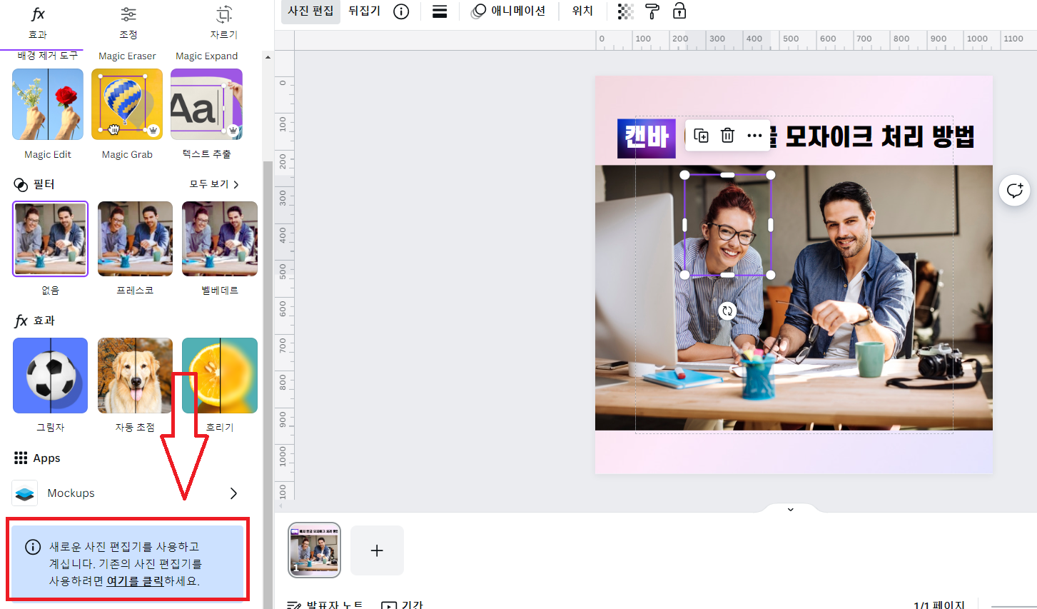 2. 같은 사진을 가지고 와서 원본 사진 사이즈과 같은 사이즈로 맞춘 후 모자이크 처리를 원하는 부분 만큼 사진을 줄여줍니다. 첫번째 방법과는 다른 방법을 사용할 거기 때문에 기존의 사진 편집기 부분을 클릭해 줍니다.