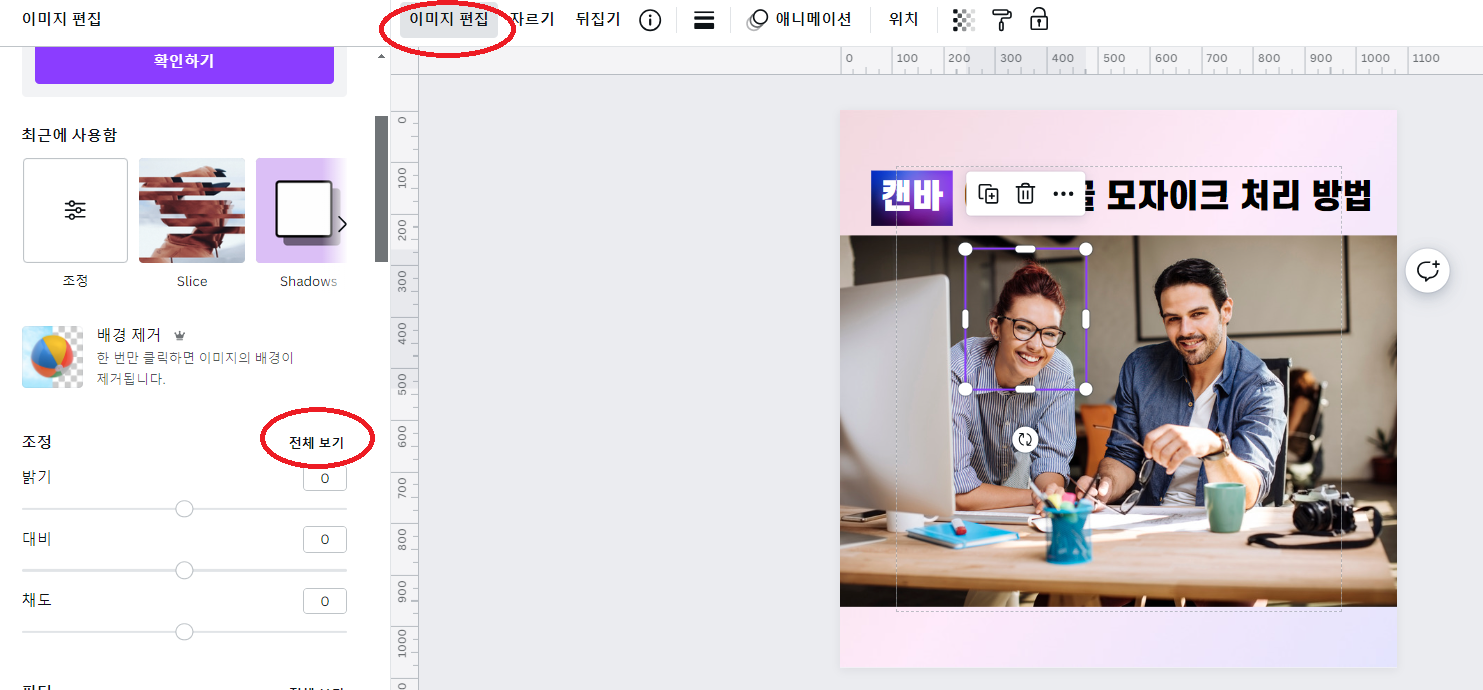 3. 왼쪽 상단의 <이미지편집> 을 클릭 후, 왼쪽 화면의 조정에서 전체보기를 클릭합니다.